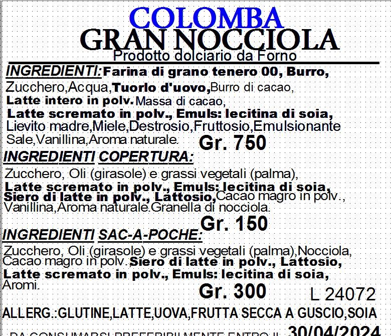 Colomba Gran Nocciola 900g + Sac à Poche 300g + Uovo al Latte Stagnolato 250g quantità